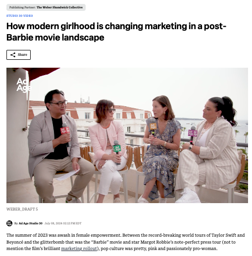 Published in the wake of the “Barbie” movie phenomenon, this conversation examines how modern girlhood is reshaping marketing—from identity and aspiration to community, creativity, and cultural power. Shot on the terrace of IPG Mediabrands’ suite in the JW Marriott in Cannes and featuring Weber Shandwick’s Gail Heimann, Mattel’s Lisa McKnight, and Talk to Jess’ Jess Weiner, the discussion explores how brands are recalibrating their approach to reach girls and young women as multidimensional audiences with agency, influence, and evolving expectations. The result is a nuanced look at how culture, commerce, and representation intersect in a post-“Barbie” marketing landscape—and what today’s shifts signal for the future. (July 8, 2024; The Weber Shandwick Collective)