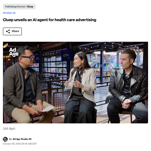 Shot on location at Ad Age’s Business of Brands 2025 conference in Chicago, this conversation explores how agentic AI is beginning to reshape health care advertising—from autonomous decisioning to privacy-safe personalization. Stacey McInnes of Cluep and Jay Manara of Klick joined me to discuss how AI agents can help health care marketers navigate regulatory complexity while driving relevance and performance at scale. The result is a grounded look at where agentic AI is already creating value today—and what it will take to move from experimentation to real operational impact. (Oct. 9, 2025; Cluep)