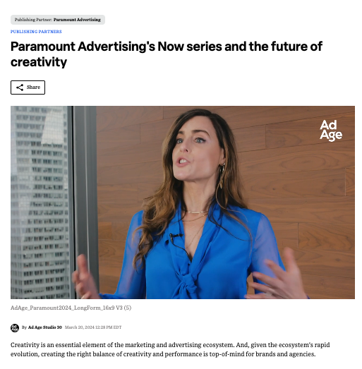 This was the second Studio 30 covering Paramount Advertising’s Now series, exploring how the company is rethinking creativity in an era defined by data, automation, and premium video. This video featured offstage one-on-ones with speakers from the Creative Now conference, including keynote speaker Swan Sit, Google’s Abigail Posner, Unilever’s Casey DePalma, and Paramount’s Steve Ellis, Lydia Daly, and Dario Spina, while the article covered the whole event. Together, the article and video translated live insights into long-form storytelling with lasting relevance for brands and agencies navigating the future of TV and streaming. (March 20, 2024; Paramount Advertising)
